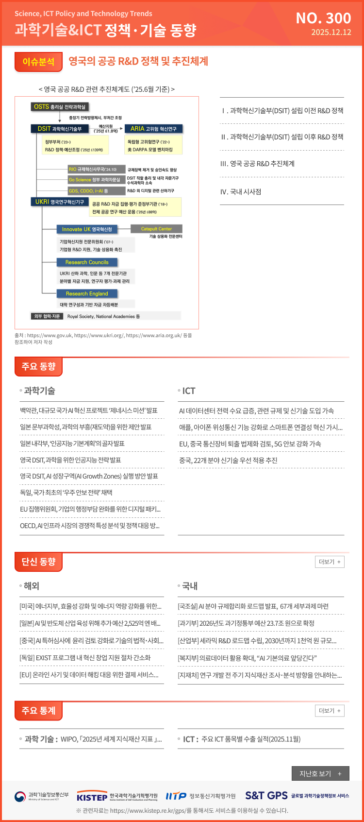 이슈분석 300호 영국의 공공 R&D 정책 및 추진체계 발간일 2025-12-12 299호 첨단 R&D 경쟁의 시대: 글로벌 과학기술정책 동향과 한국의 전략 발간일 2025-11-28 298호 MASGA 시대의 조선기자재 산업 대응 발간일 2025-11-14 297호 허깅페이스 개방형 LLM 리더보드 영향과 시사점 발간일 2025-10-31 더보기