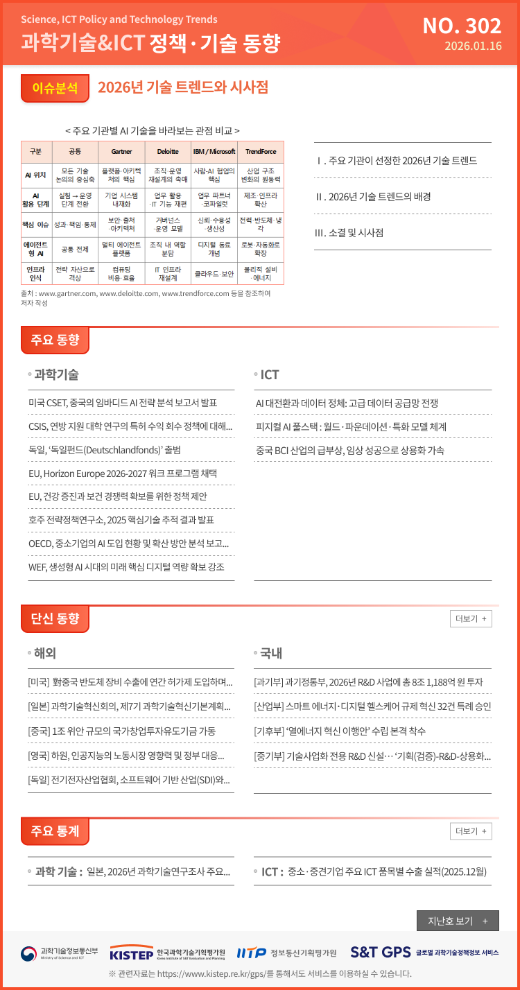 이슈분석 302호 2026년 기술 트렌드와 시사점 발간일 2026-01-16 301호 이식형 뇌-컴퓨터 인터페이스 최신 동향 및 전망 발간일 2025-12-26 300호 영국의 공공 R&D 정책 및 추진체계 발간일 2025-12-12 299호 첨단 R&D 경쟁의 시대: 글로벌 과학기술정책 동향과 한국의 전략 발간일 2025-11-28 더보기