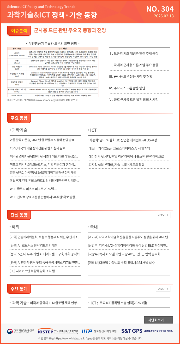 이슈분석 304호 군사용 드론 관련 주요국 동향과 전망 발간일 2026-02-13 303호 국가 사이버보안 전략에서 본 국제 협력의 변화 발간일 2026-01-29 302호 2026년 기술 트렌드와 시사점 발간일 2026-01-16 301호 이식형 뇌-컴퓨터 인터페이스 최신 동향 및 전망 발간일 2025-12-26 더보기